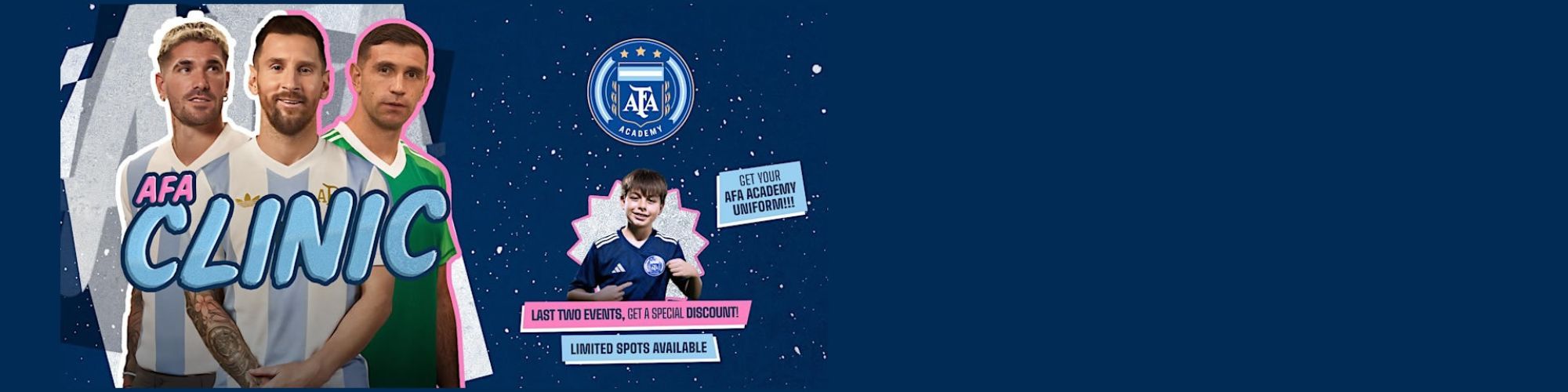 Incluye: Un kit de entrenamiento de AFA Academies completo (camiseta, shorts y medias) para usar durante las clínicas.